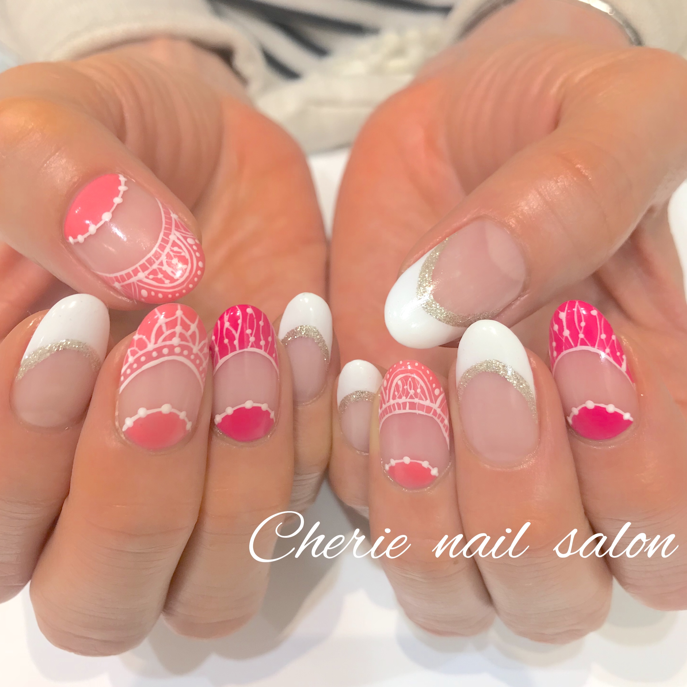 ピンクと白のフレンチにニュアンス柄で春らしいデザイン☆