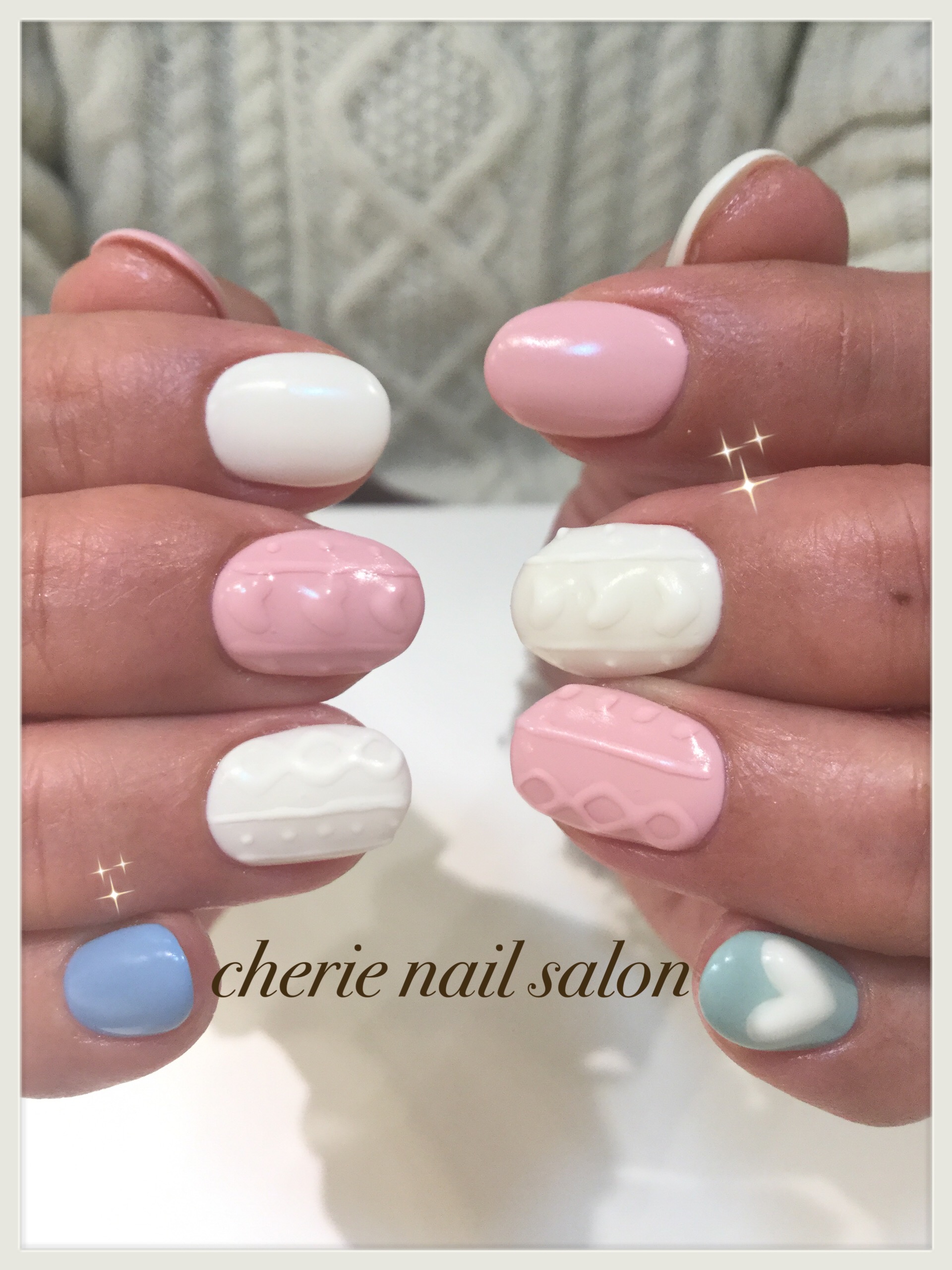 パステルカラーでのニットネイルがガーリーで可愛いです☆ 小指のぷっくりハートもポイントです☺︎