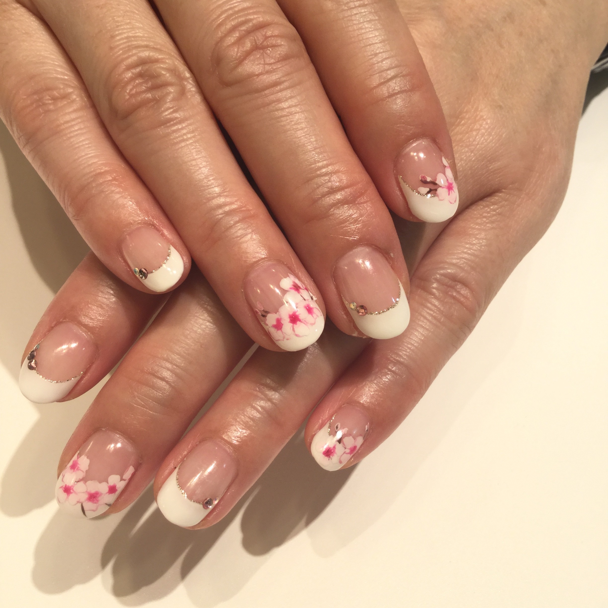シンプルな白フレンチをベースに、お花畑みたいなフラワーアートが上品です☺︎