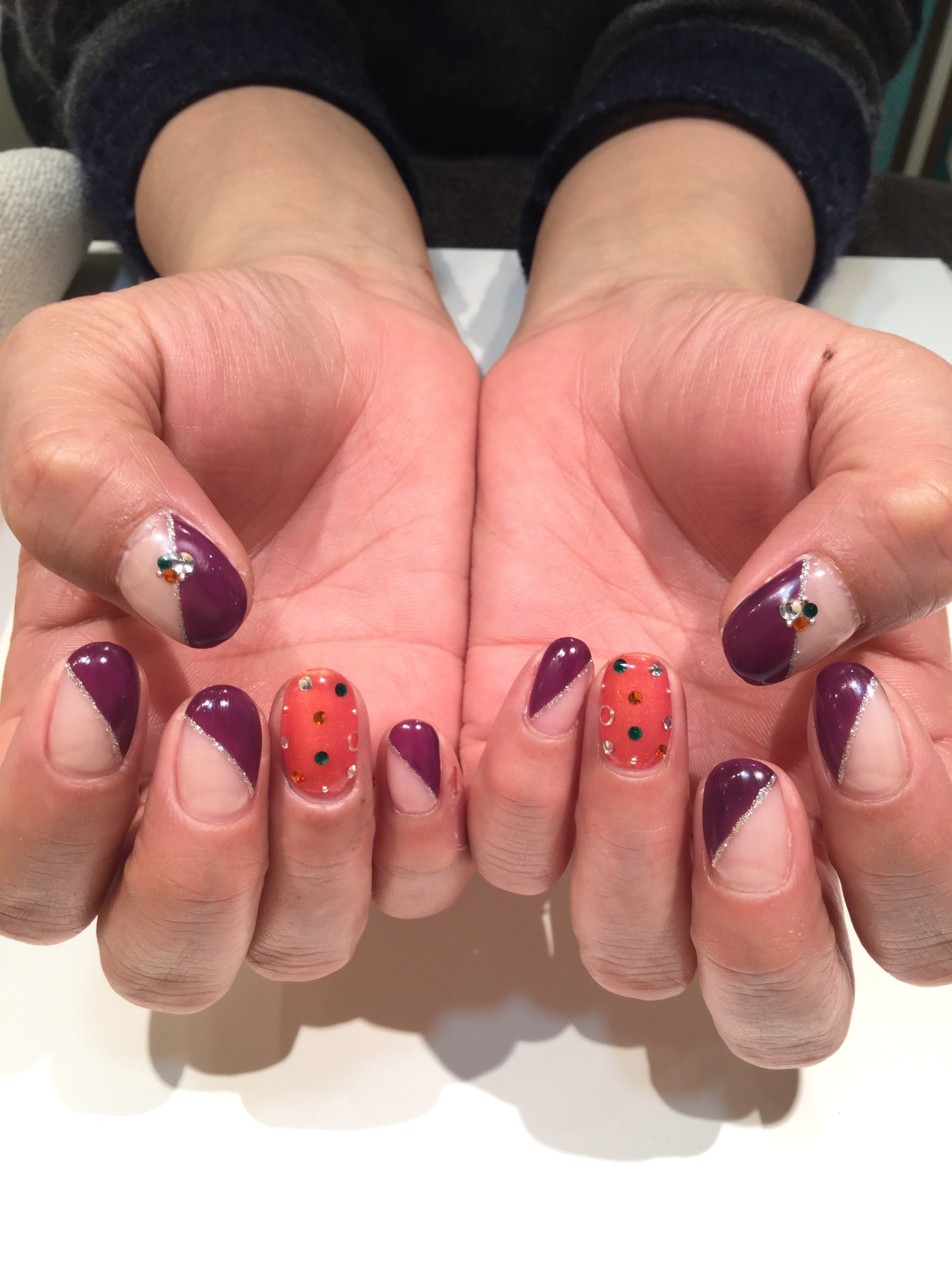 パープル✖️オレンジにカラフルなストーンが個性的で目を引きます?