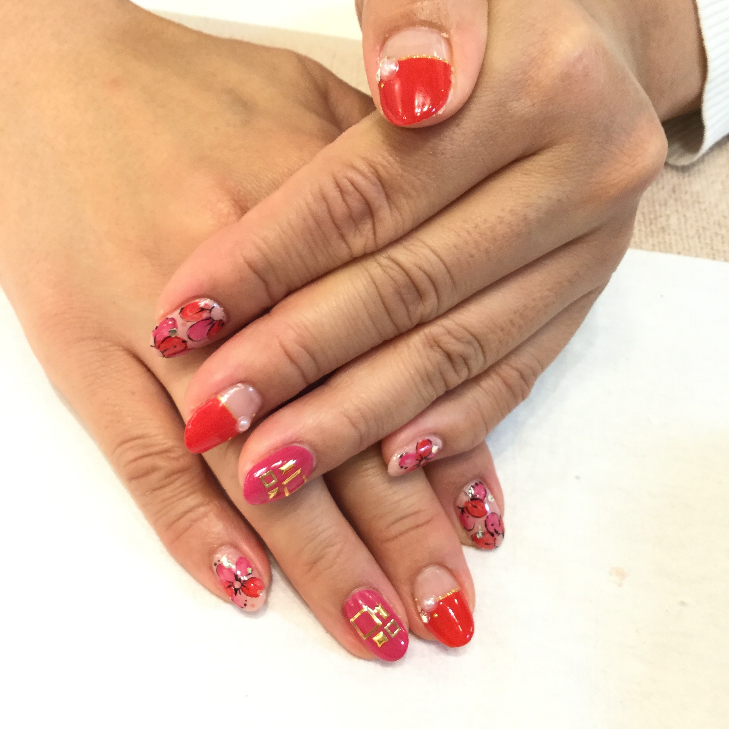 赤、ピンクでまとめた華やかな女子ネイル! キュートなお花とゴールドパーツのコンビがゴージャス☺︎