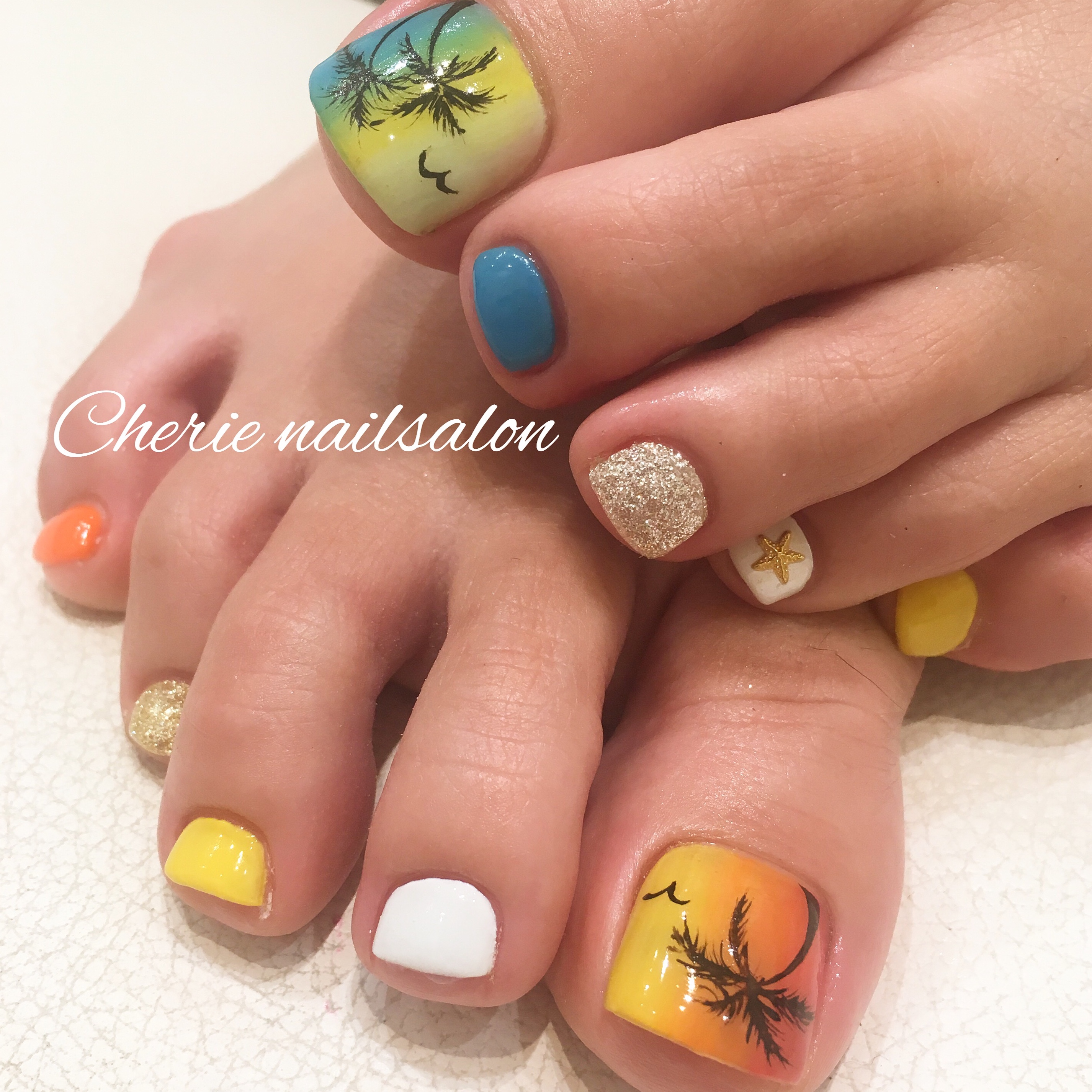 足は濃いめの色で華やかに? ヤシの木も色味も夏ですね♪